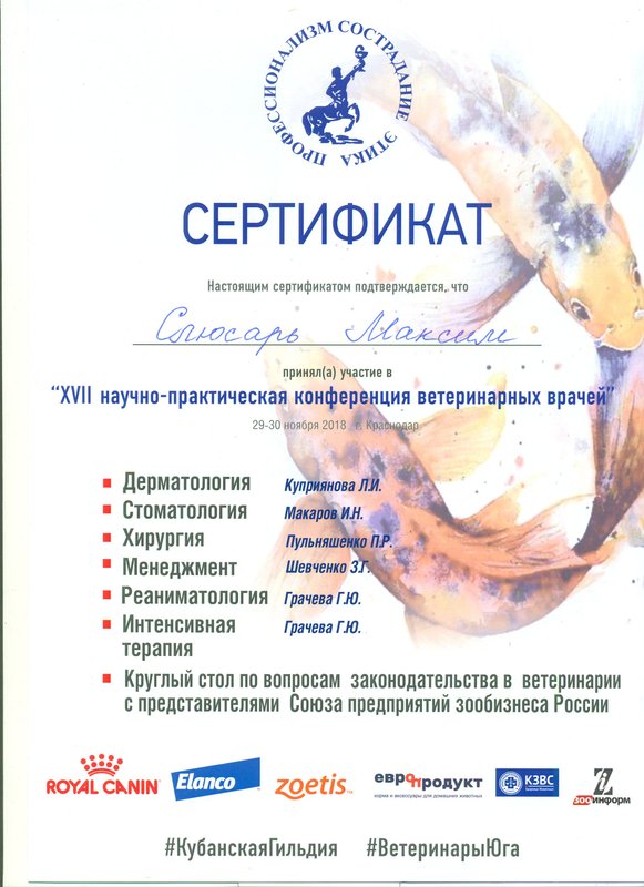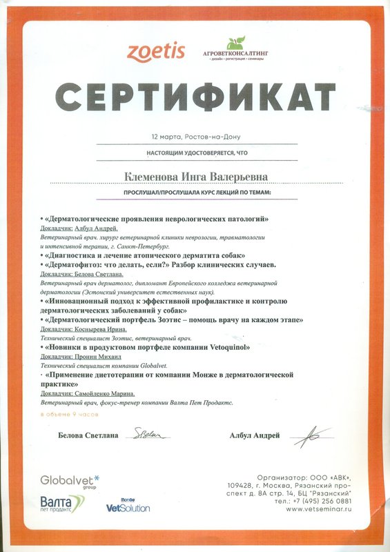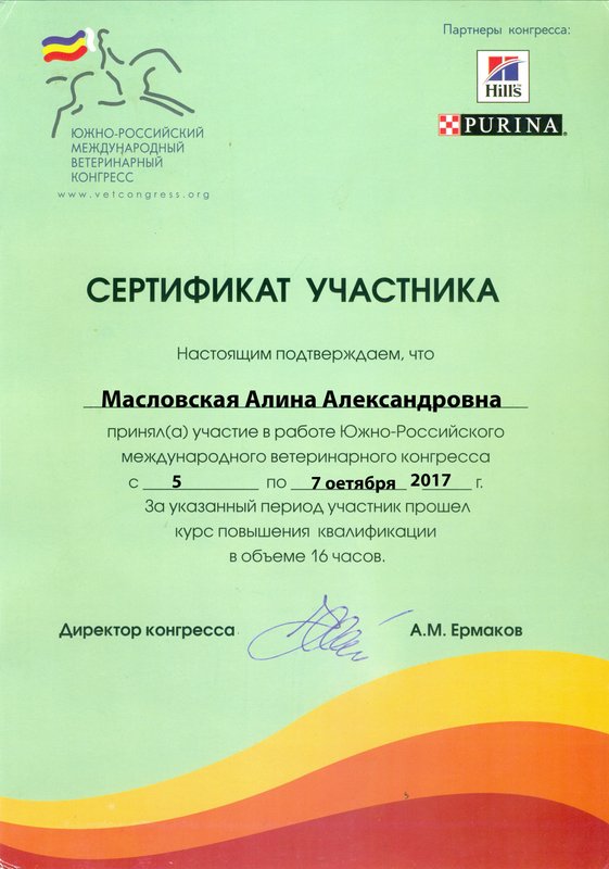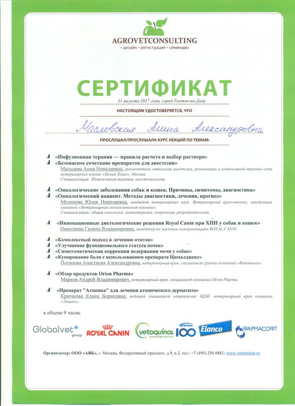 Главный врач клиники на Плиева, Офтальмолог.В 2006 году закончила медицинский лицей на базе школы №43, в 2008 «Ростовский базовый медицинский колледж» с красным дипломом. В 2013 году закончила факультет биологических наук ЮФУ по специальности «зоология». В 2017 Новочеркасский колледж аграрных технологий. Ветеринарная практика с 2013 года. Прошла курсы постдипломного образования по направлению офтальмология школы доктора Соломахиной Л.А. 2014 г. Курсы ультразвуковой диагностики на базе «ооо Бальф» г. Санкт-Петербург, первая, вторая ступени(2017-2018 года). Прошла в 2019 году обучение по забору биоматериала под контролем УЗИ на базе клиники Центр г. Москва, под руководством Зуевой Н.М.. Обучение на базе клиники «Командор» 2019 г. по теме «Исследование красного костного мозга и ОАК». 2019 г обучение на базе клиники «Кот и Пес» г. Санкт-Петербург по направлению «Эхокардиография мелких домашних животных». 2021 г обучение по направлению «Кардиология мелких домашних животных». Преподаватель курса Комолов А.Г., президент Ветеринарного кардиологического общества, клиника «Белый Клык», г. Москва. Ежегодно посещает лекции в он-лайн и офф-лайн режимах и ветеринарные конгрессы. На данный момент ведет общий терапевтический, общий хирургический, офтальмологический, кардиологический приемы. Врач УЗ-диагностики. Подробнее узнать о деятельности клиники вы можете, посетив сайт организации, а также страничку в социальной сети http://vk.com/vet_rostov. На сайте вет-ростов.рф есть вся подробная информация.